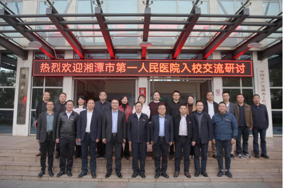 11月26日下午,湘潭市第一人民医院来我校交流,座谈会在二会议室举行。湘潭市第一人民医院党委书记袁海斌,党委副书记、副院长杨杰,我校党委书记黄昕,党委委员、副校长魏克湘及相关职能部门负责人参加会议,会议由魏克湘主持。